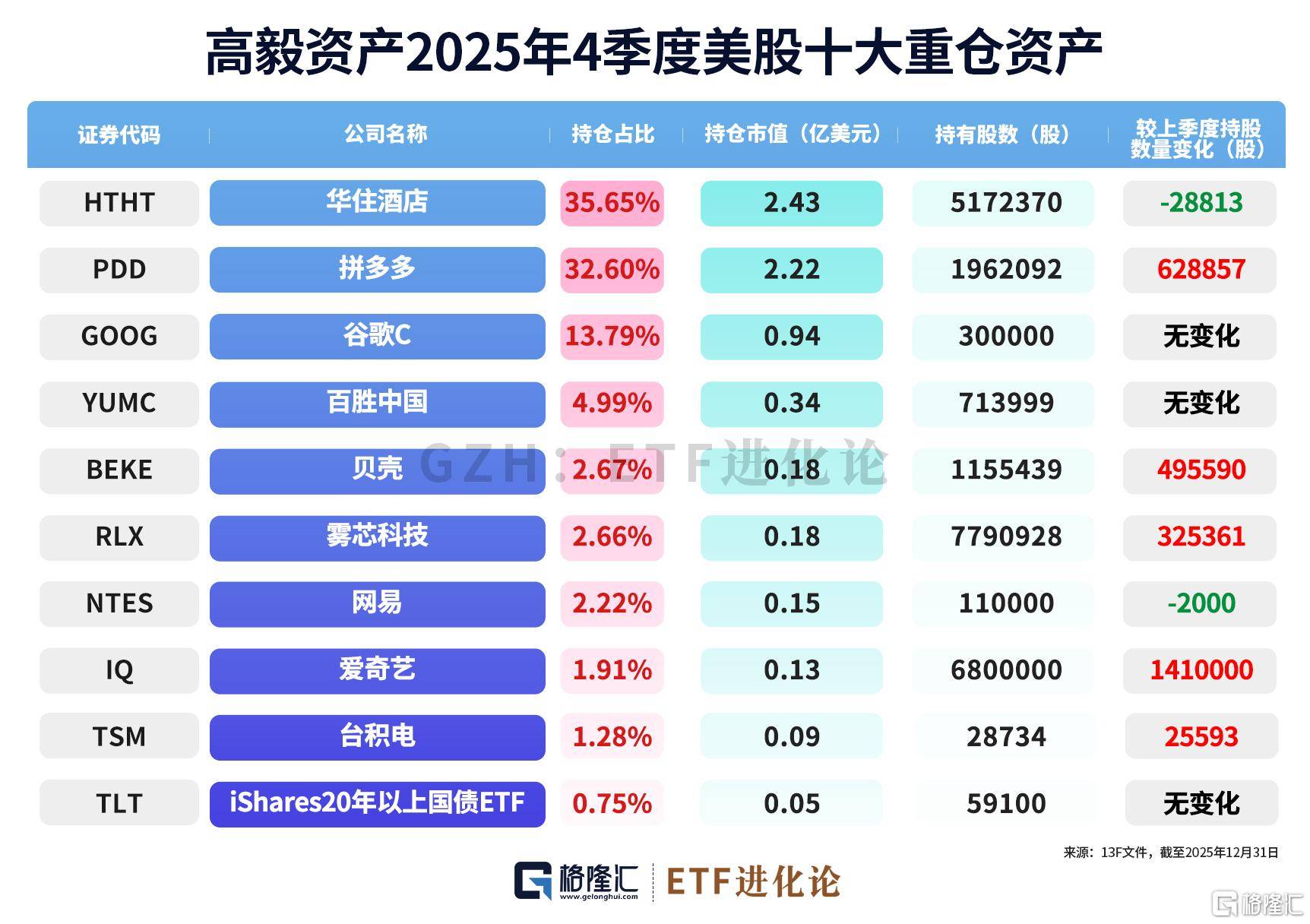 2025年第四季度(du),高毅海外基金前十大重(zhong)仓股中,增持拼多多、贝壳、雾芯(xin)科技、爱(ai)奇艺、台积电;减持华住酒店、网易;谷(gu)歌C、百胜中国、iShares 20年以上国债ETF持仓不变。