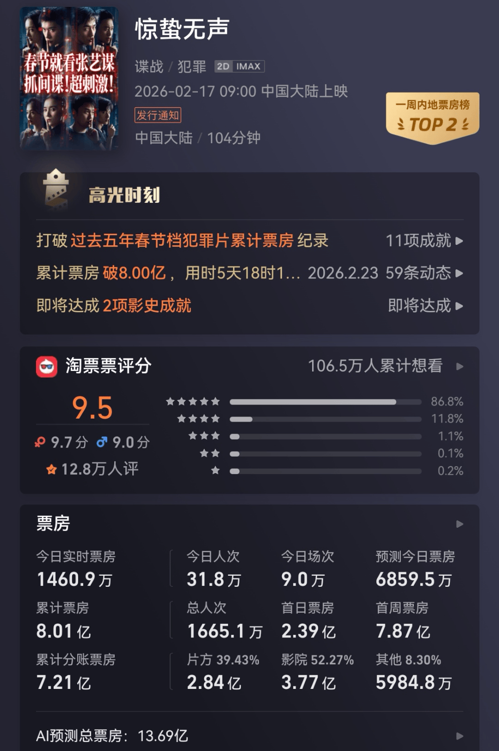 受口碑拖累,《惊蛰无声(sheng)》被《镖人》反(fan)超(chao),被《熊出没·年(nian)年(nian)有熊》追近,单日票房由第二跌到了第三,上座率(lu)没有及《飞奔人生3》《熊出没·年(nian)年(nian)有熊》《镖人》,落到第四,目前累计票房刚刚冲破8亿元。猫眼专业版、灯塔专业版分别将其终(zhong)究预(yu)测总票房下调到了12.33亿元、13.69亿元。